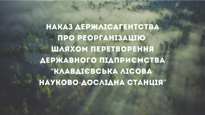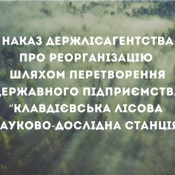 Повідомляємо про оприлюднення наказу Державне агентство лісових ресурсів України щодо реорганізації державного підприємства «Клавдієвська лісова науково-дослідна станція» шляхом перетворення у товариство з обмеженою відповідальністю.